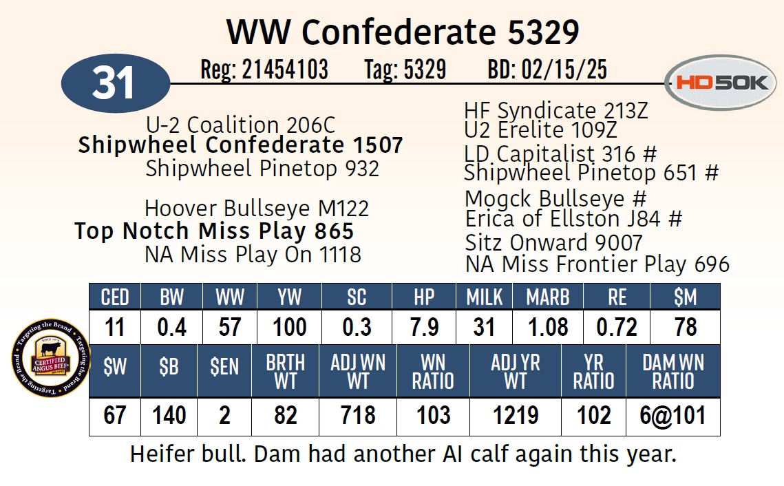 | WW Confederate 5329 | 31 | Yearling Bull | Heifer bull. Dam had another AI calf again this year |