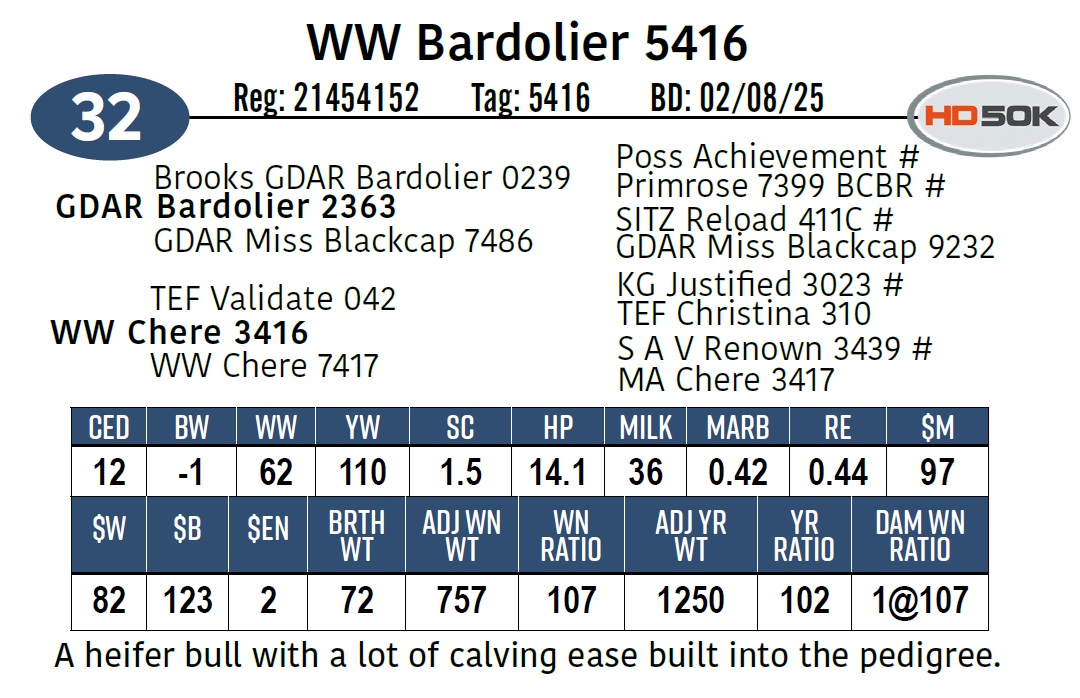 | WW Bardolier 5416 | 32 | Yearling Bull | A heifer bull with a lot of calving ease built into the pedigree. |
