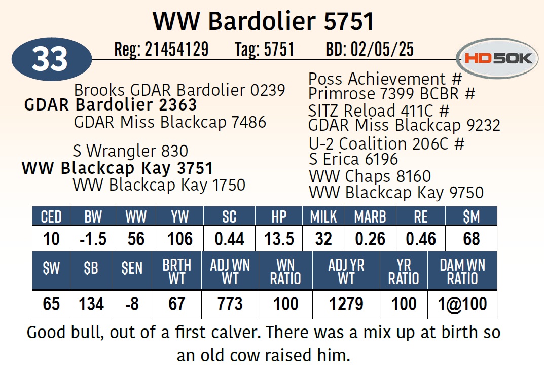 | WW Bardolier 5751 | 33 | Yearling Bull | Good bull, out of a first calver. There was a mix up at birth so an old cow raised him. |