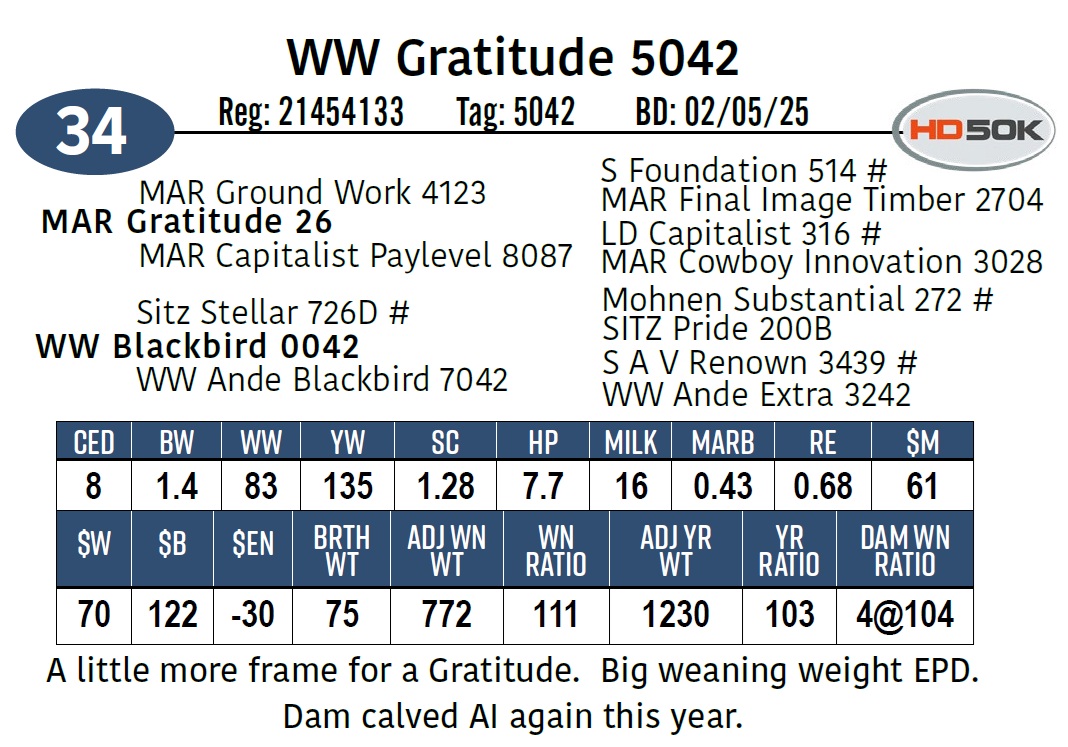 | WW Gratitude 5042 | 34 | Yearling Bull | little more frame for a Gratitude. Big weaning weight EPD. Dam calved AI again this year |