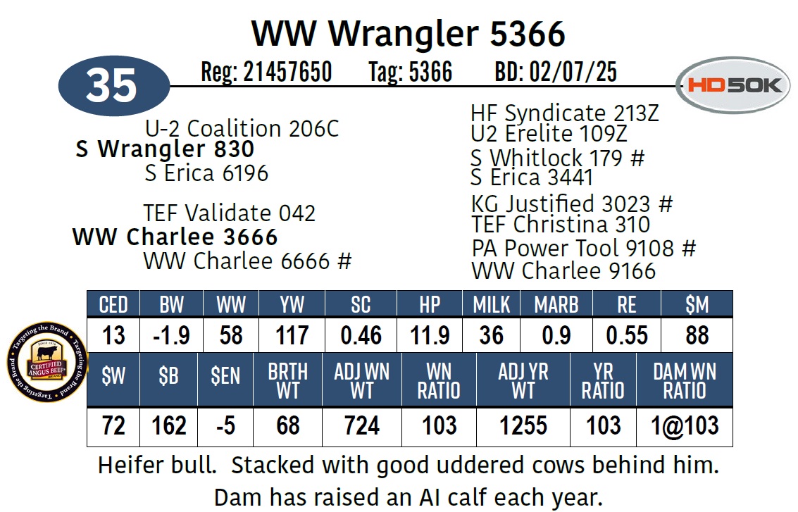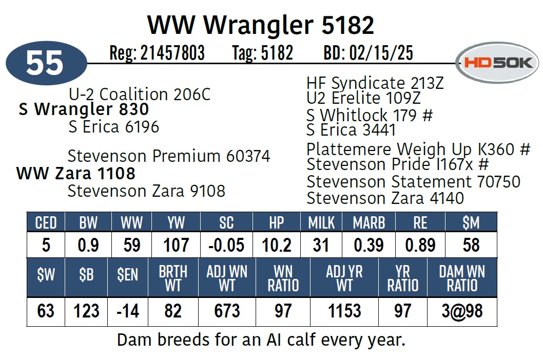 | WW Wrangler 5182 | 55 | Yearling Bull | Dam breeds for an AI calf every year |