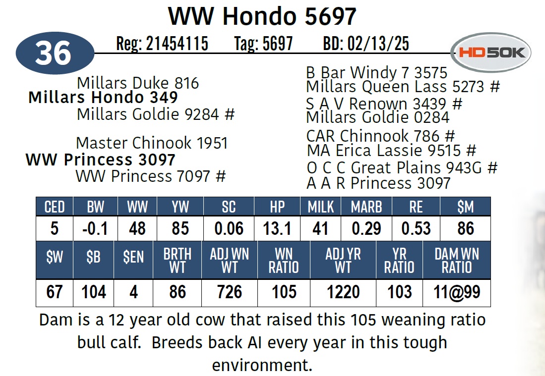 | WW Hondo 5697 | 36 | Yearling Bull | Dam is a 12 year old cow that raised this 105 weaning ratio bull calf. Breeds back AI every year in this tough environment. |