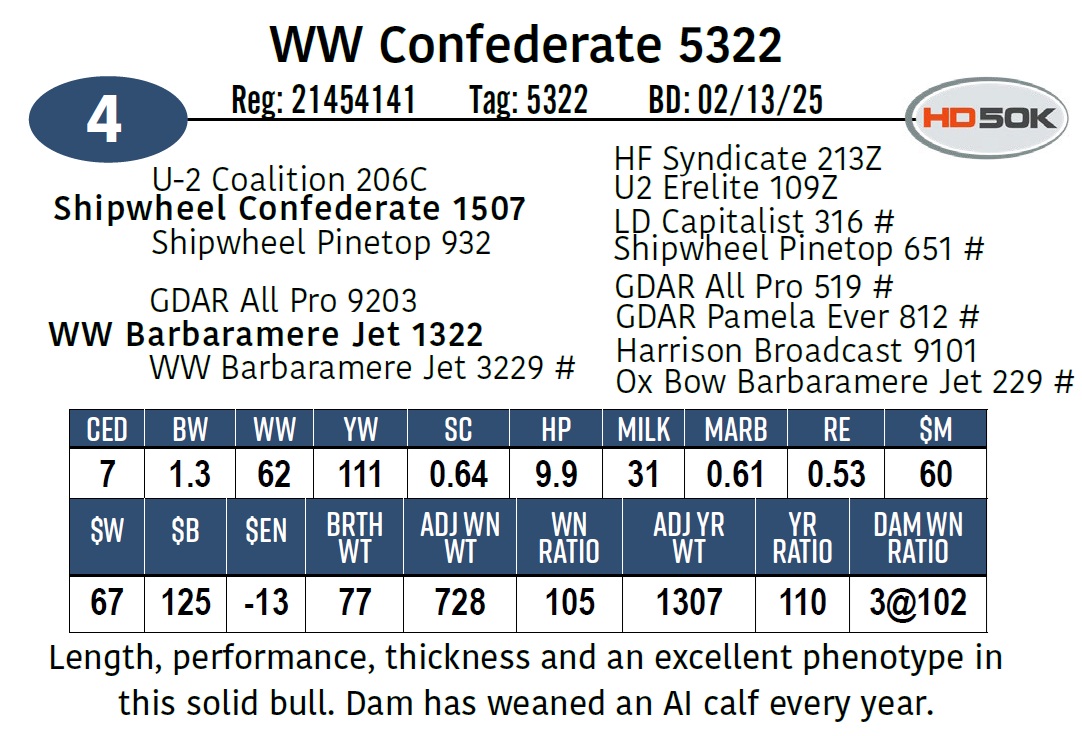 | WW Confederate 5322 | 4 | Yearling Bull | Length, performance, thickness and an excellent phenotype in this solid bull. Dam has weaned an AI calf every year. |