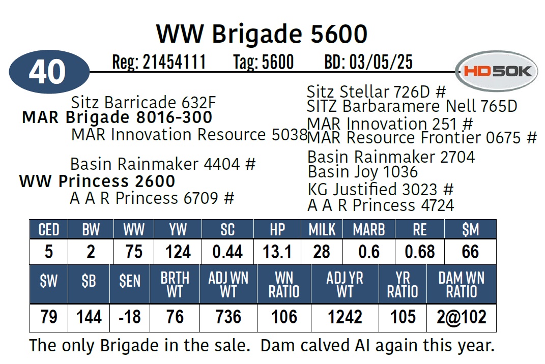 | WW Brigade 5600 | 40 | Yearling Bull | The only Brigade in the sale. Dam calved AI again this year |