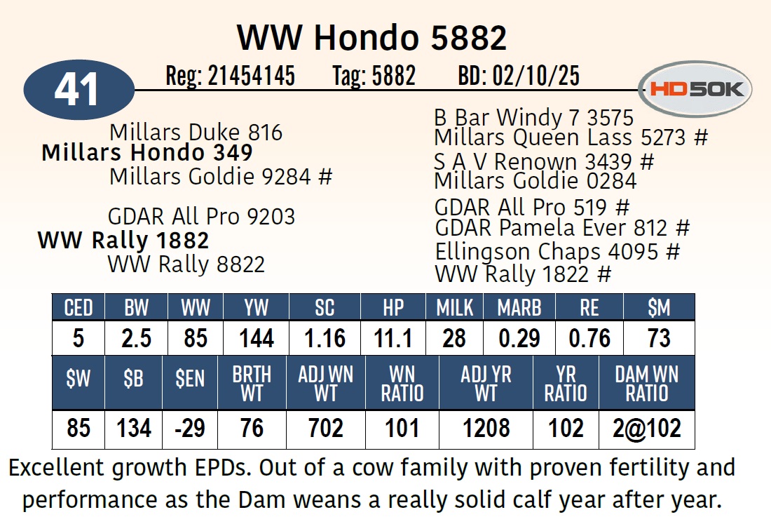 | WW Hondo 5882 | 41 | Yearling Bull | Excellent growth EPDs. Out of a cow family with proven fertility and performance as the Dam weans a really solid calf year after year |