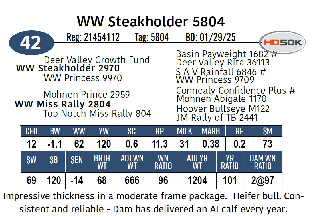 | WW Steakholder 5804 | 42 | Yearling Bull | Impressive thickness in a moderate frame package. Heifer bull. Consistent and reliable - Dam has delivered an AI calf every year |