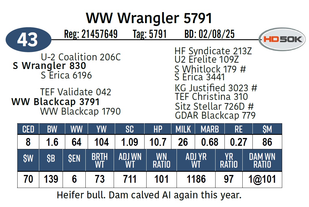 | WW Wrangler 5791 | 43 | Yearling Bull | Heifer bull. Dam calved AI again this year. |