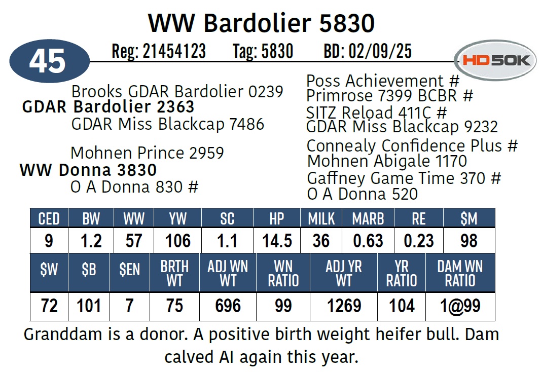 | WW Bardolier 5830 | 45 | Yearling Bull | Granddam is a donor. A positive birth weight heifer bull. Dam calved AI again this year. |