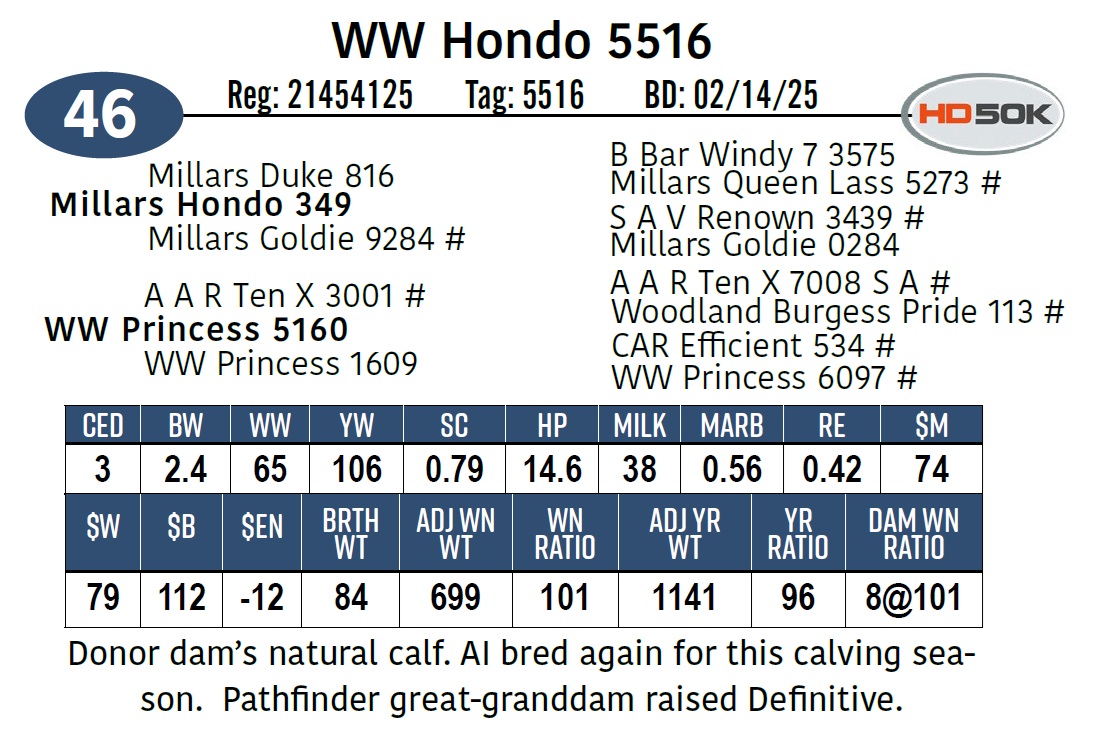 | WW Hondo 5516 | 46 | Yearling Bull | Donor dam’s natural calf. AI bred again for this calving season. Pathfinder great-granddam raised Definitive. |