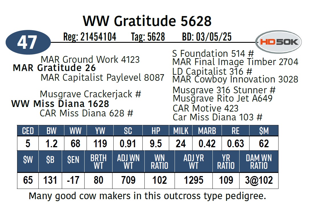 | WW Gratitude 5628 | 47 | Yearling Bull | Many good cow makers in this outcross type pedigree. |