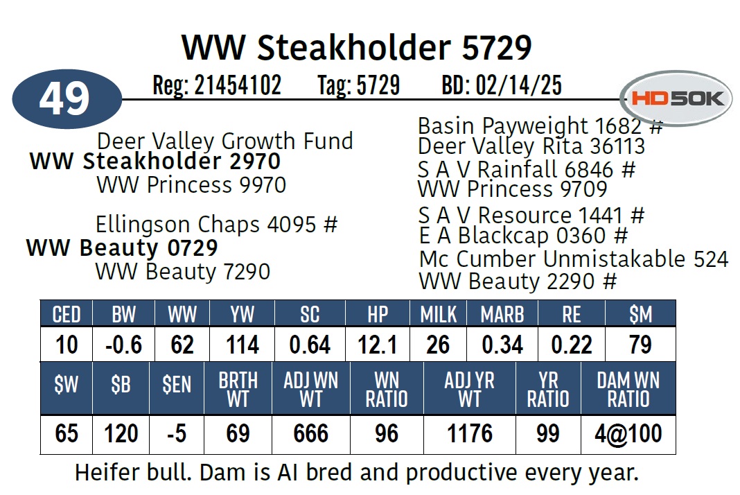 | WW Steakholder 5729 | 49 | Yearling Bull | Heifer bull. Dam is AI bred and productive every year |