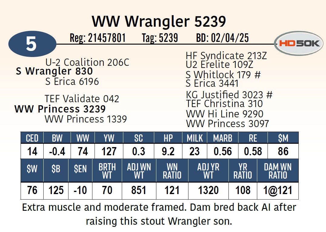 | WW Wrangler 5239 | 5 | Yearling Bull | Extra muscle and moderate framed. Dam bred back AI after raising this stout Wrangler son. |