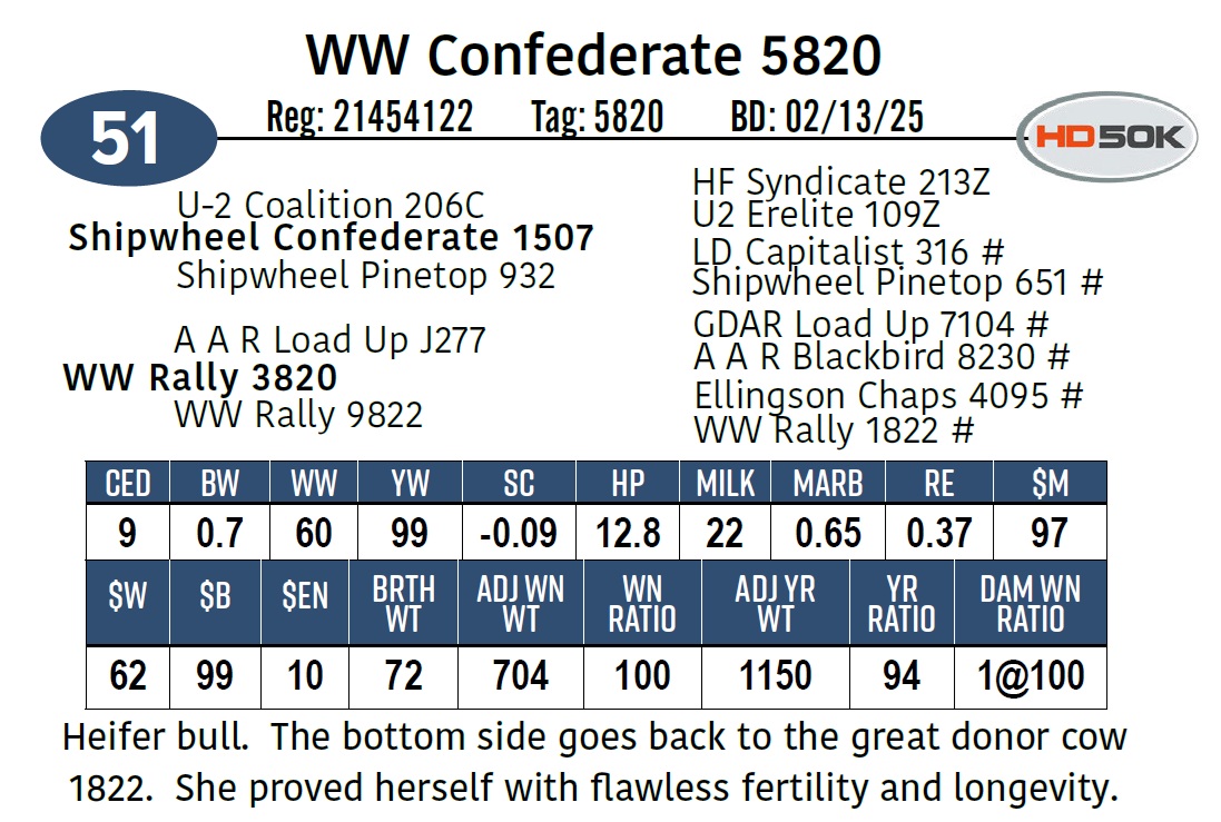 | WW Confederate 5820 | 51 | Yearling Bull | Heifer bull. The bottom side goes back to the great donor cow 1822. She proved herself with flawless fertility and longevity. |