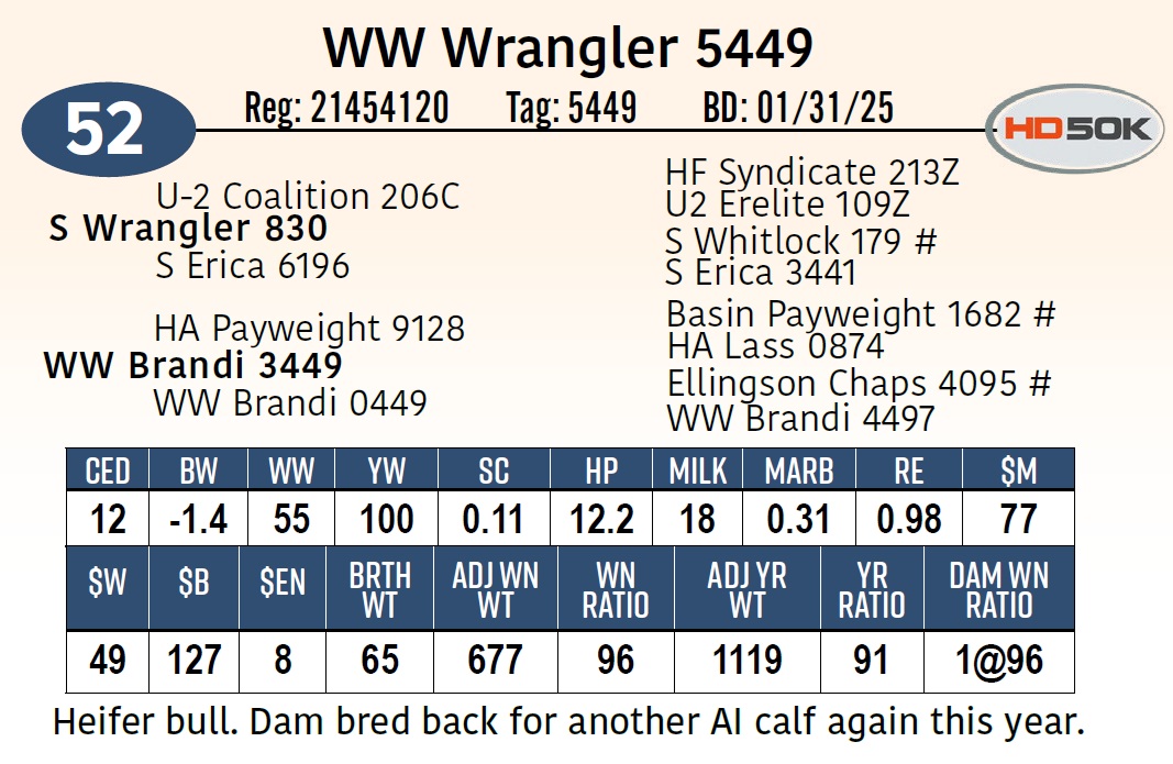 | WW Wrangler 5449 | 52 | Yearling Bull | Heifer bull. Dam bred back for another AI calf again this year |
