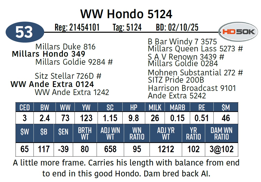 | WW Hondo 5124 | 53 | Yearling Bull | A little more frame. Carries his length with balance from end to end in this good Hondo. Dam bred back AI. |