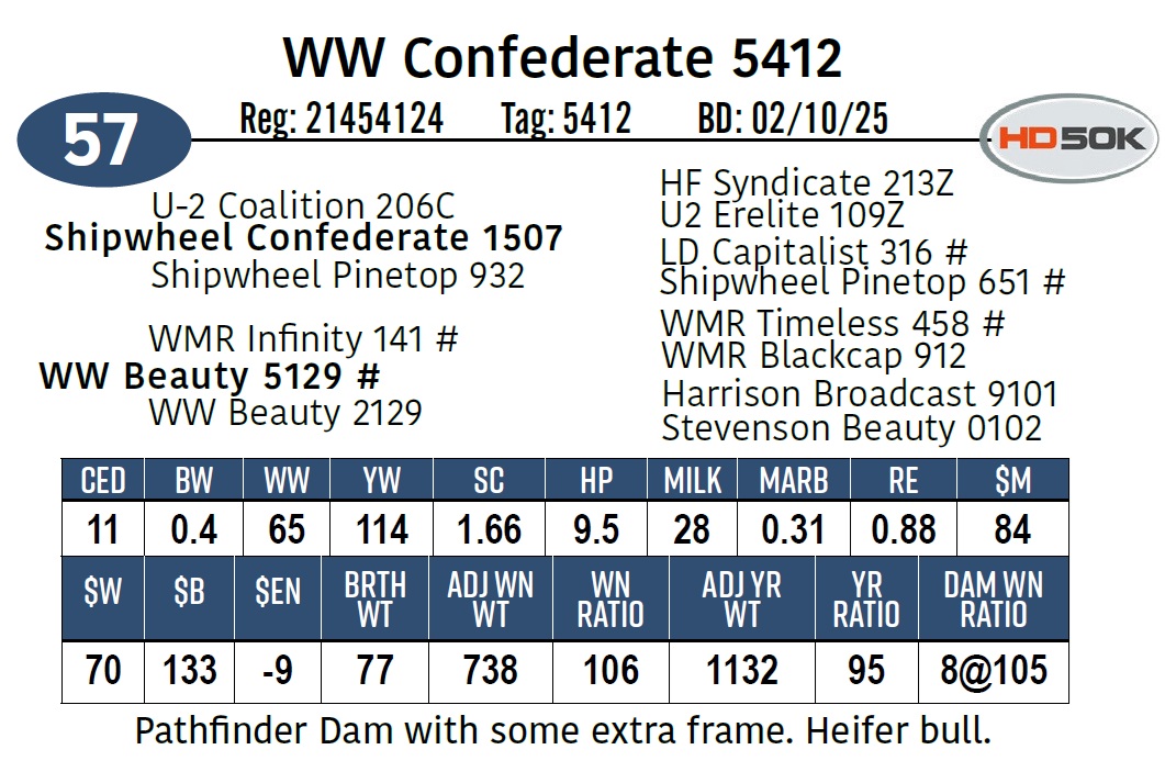 | WW Confederate 5412 | 57 | Yearling Bull | Pathfinder Dam with some extra frame. Heifer bull. |