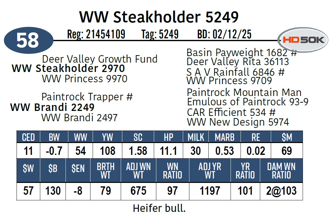 | WW Steakholder 5249 | 58 | Yearling Bull | Heifer bull |
