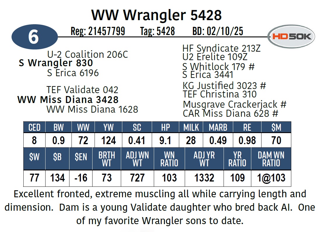 | WW Wrangler 5428 | 6 | Yearling Bull | Excellent fronted, extreme muscling all while carrying length and dimension. Dam is a young Validate daughter who bred back AI. One of my favorite Wrangler sons to date. |