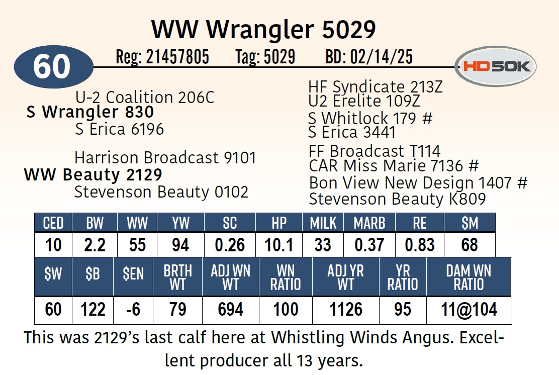 | WW Wrangler 5029 | 60 | Yearling Bull | This was 2129’s last calf here at Whistling Winds Angus. Excellent producer all 13 years. |