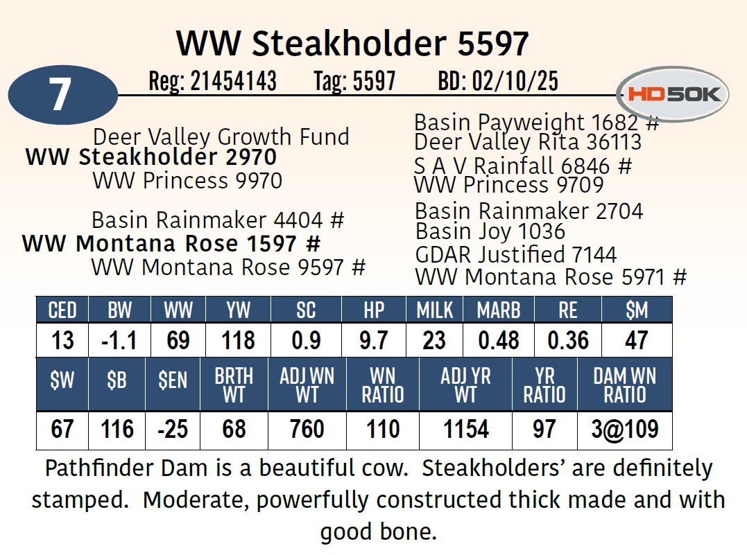 | WW Steakholder 5597 | 7 | Yearling Bull | Pathfinder Dam is a beautiful cow. Steakholders’ are definitely stamped. Moderate, powerfully constructed thick made and with good bone. |
