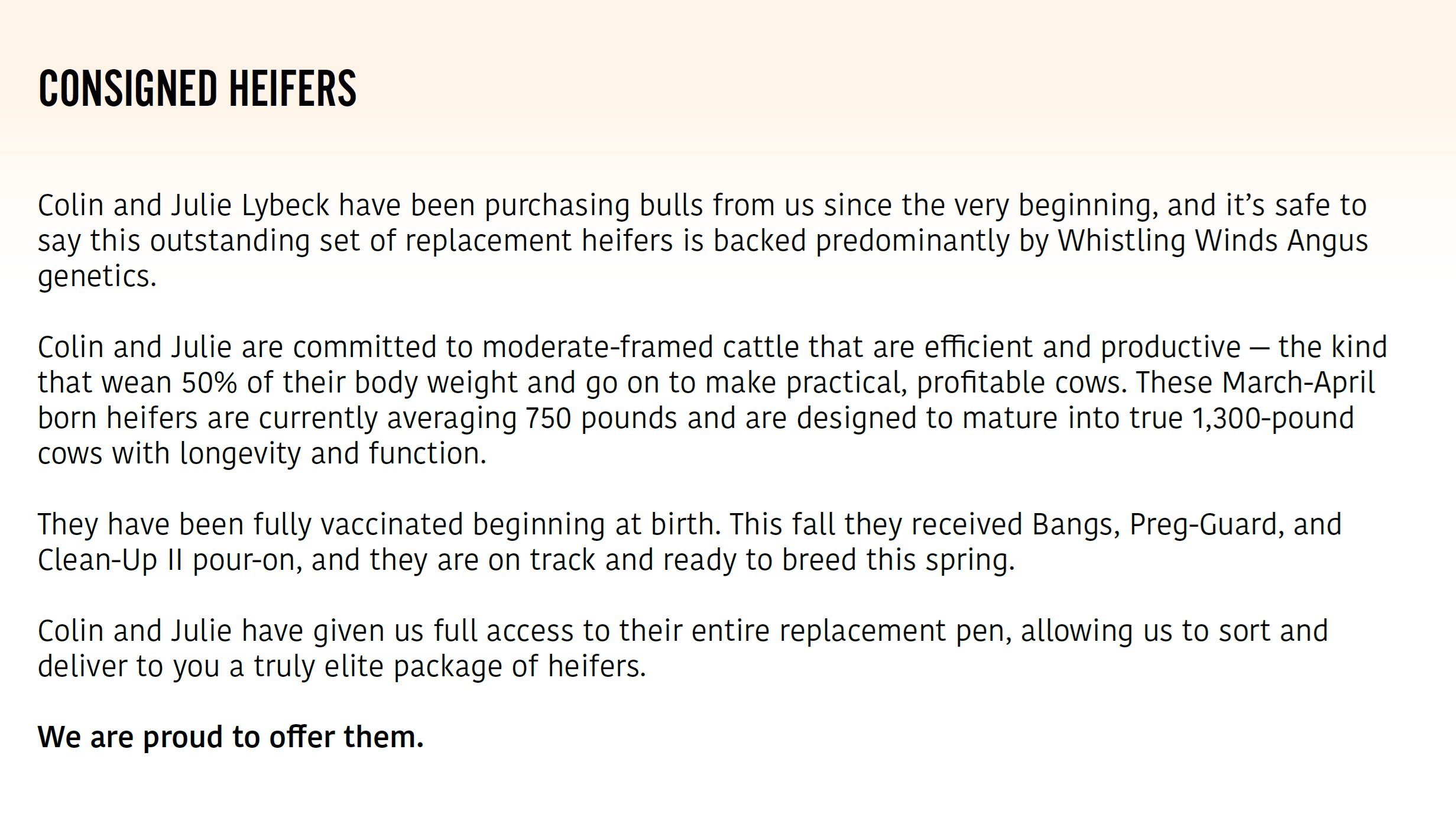 | Heifers | 70 | Yearling Heifers | Colin and Julie Lybeck have been purchasing bulls from us since the very beginning, and it’s safe to say this outstanding set of replacement heifers is backed predominantly by Whistling Winds Angus genetics. Colin and Julie are committed to moderate-framed cattle that are efficient and productive — the kind that wean 50% of their body weight and go on to make practical, profitable cows. These March-April born heifers are currently averaging 750 pounds and are designed to mature into true 1,300-pound cows with longevity and function. They have been fully vaccinated beginning at birth. This fall they received Bangs, Preg-Guard, and Clean-Up II pour-on, and they are on track and ready to breed this spring. Colin and Julie have given us full access to their entire replacement pen, allowing us to sort and deliver to you a truly elite package of heifers. |