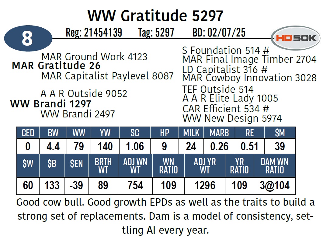 | WW Gratitude 5297 | 8 | Yearling Bull | Good cow bull. Good growth EPDs as well as the traits to build a strong set of replacements. Dam is a model of consistency, settling AI every year. |