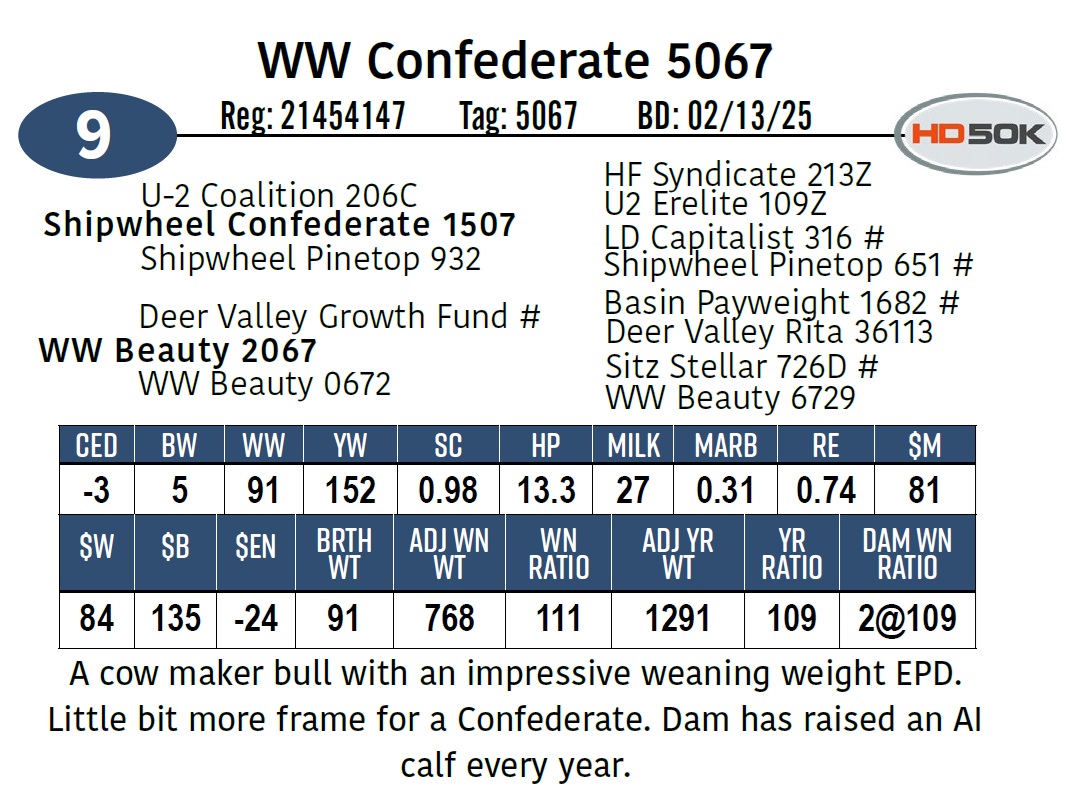 | WW Confederate 5715 | 37 | Yearling Bull | Cow bull. |